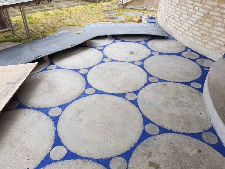 Mellemrummene blev støbt i indfarvet blå beton, med farvestof fra Rødvig kalk.